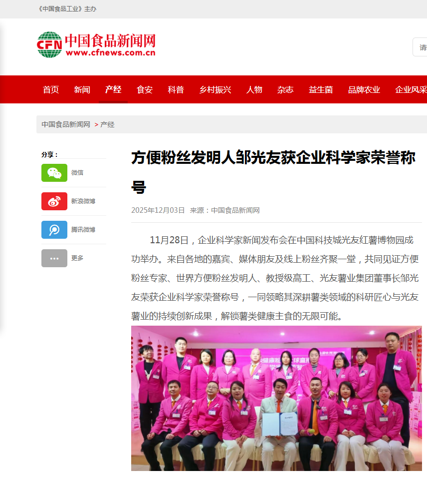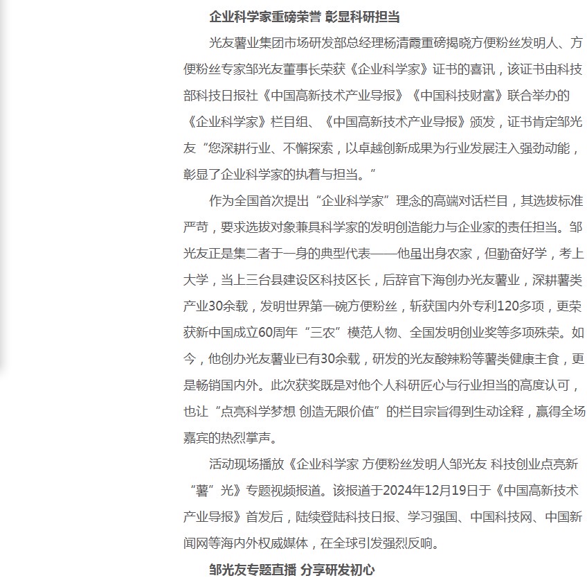 轉(zhuǎn)載中國食品新聞網(wǎng)-方便粉絲發(fā)明人鄒光友獲《企業(yè)科學(xué)家》榮譽(yù)稱號